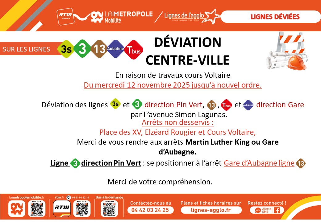 En raison de travaux sur l'avenue St Antoine aux Pennes Mirabeau, la ligne 1 est perturbée du 12 novembre 2025 jusqu'au 14 novembre 2025 entre de 8h00 à 17h00.